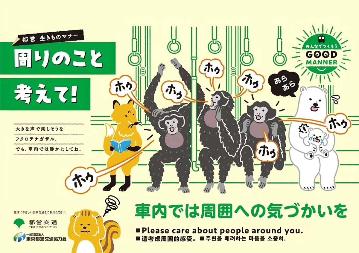 Recientemente, una imagen ha desencadenado una falsa alarma proveniente de una campaña educativa lanzada por la Oficina de Transporte de Tokio (Toei Transportation) a principios de este año. Este movimiento, denominado Modales Toei Ikimono (los modales de vida silvestre de Toei), busca promover el buen comportamiento en el transporte público utilizando imágenes de animales como metáfora para representar diferentes situaciones y comportamientos. Entre uno de los carteles de esta serie muestra a unos monos haciendo ruido para representar las molestias que pueden causar algunos pasajeros dentro de los vagones del metro.