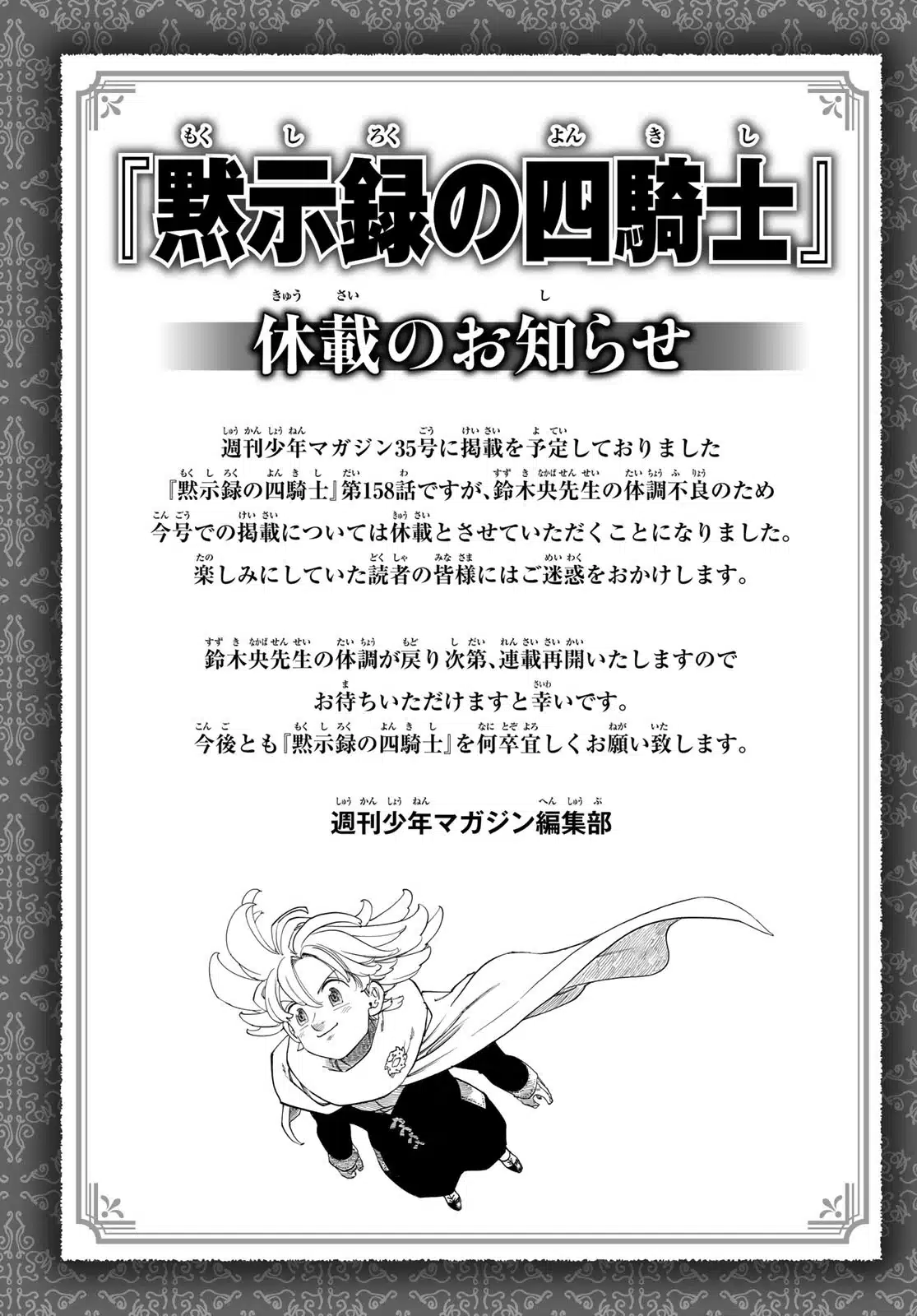 En un comunicado publicado en medios oficiales y diferentes cuentas en redes sociales, se publicรณ que la editorial Weekly Shonen Magazine ha anunciado que el manga Mokushiroku no Yonkishi no aparecerรก en el nรบmero 35 de la revista, como estaba originalmente planeado. La pausa se debe a la condiciรณn mรฉdica de Nakaba Suzuki, quien ha experimentado problemas de salud que le impiden continuar con la creaciรณn de la serie en este momento.