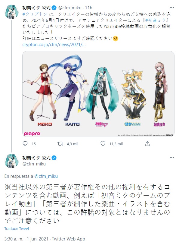 «#Crypton. Como muestra de nuestro agradecimiento por el continuo apoyo de nuestros creadores, Crypton ha anunciado que a partir del 1 de junio de 2021. ¡Los creadores amateurs podrán monetizar sus vídeos de YouTube utilizando a #Hatsune Miku y otros personajes de Piapro!»