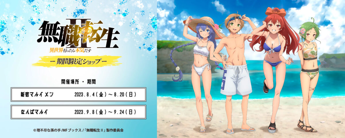 La colaboración entre la compañia «Eterno Récit» y la serie de anime Mushoku Tensei se realizará en diferentes centros de Japón y comenzará a partir del próximo 4 de agosto hasta el próximo 24 de septiembre de este mismo año.