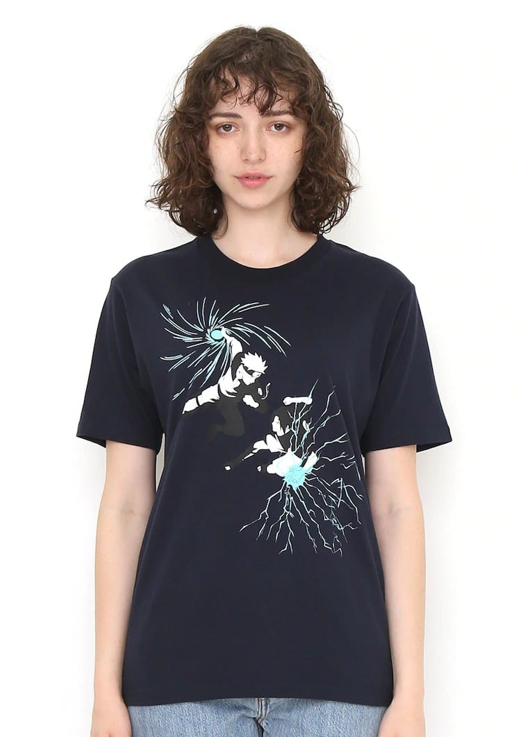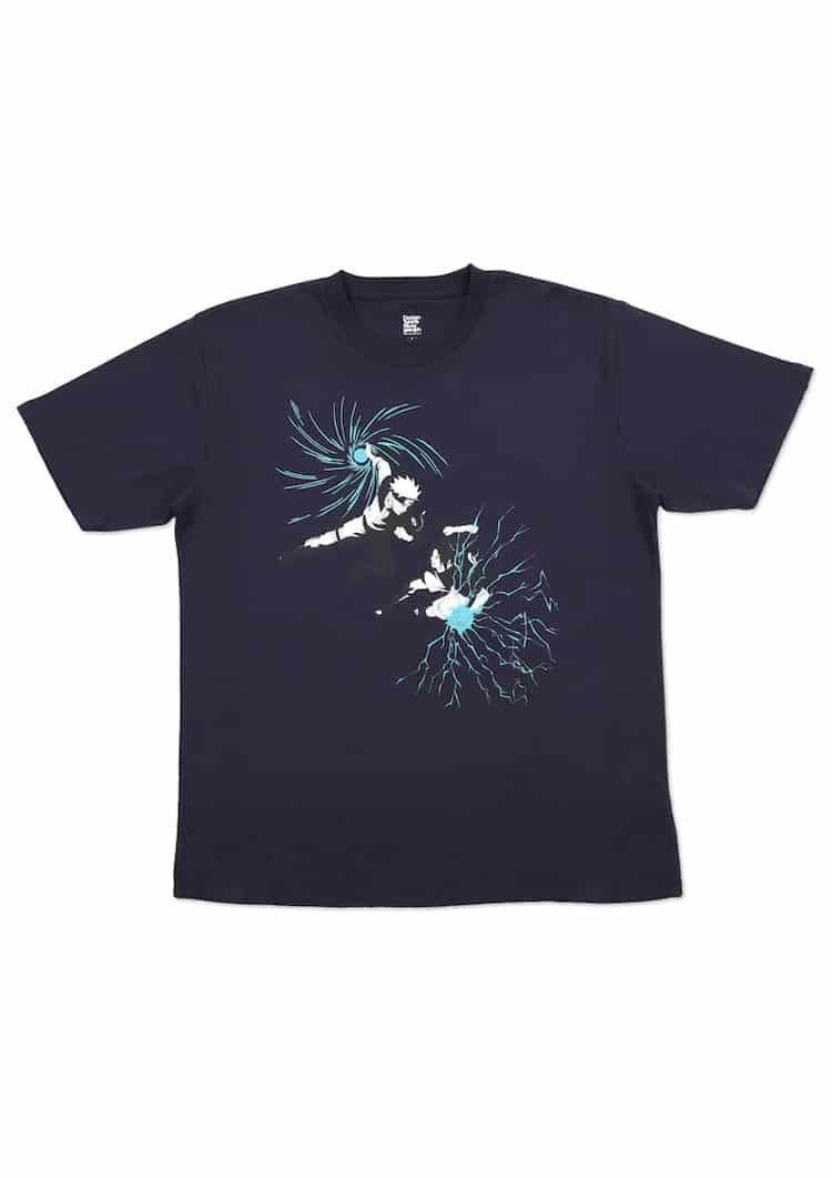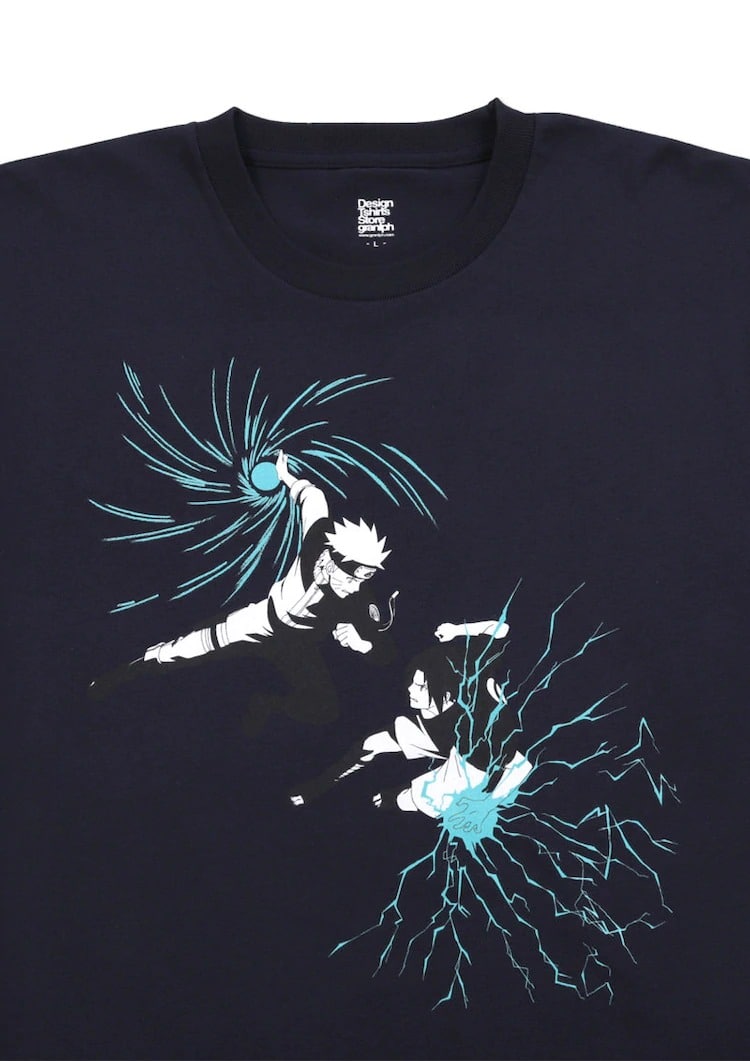 - El primer diseño muestra una camisa con la icónica batalla de Naruto y Sasuke, con un poco de ayuda de tinta fosforescente.