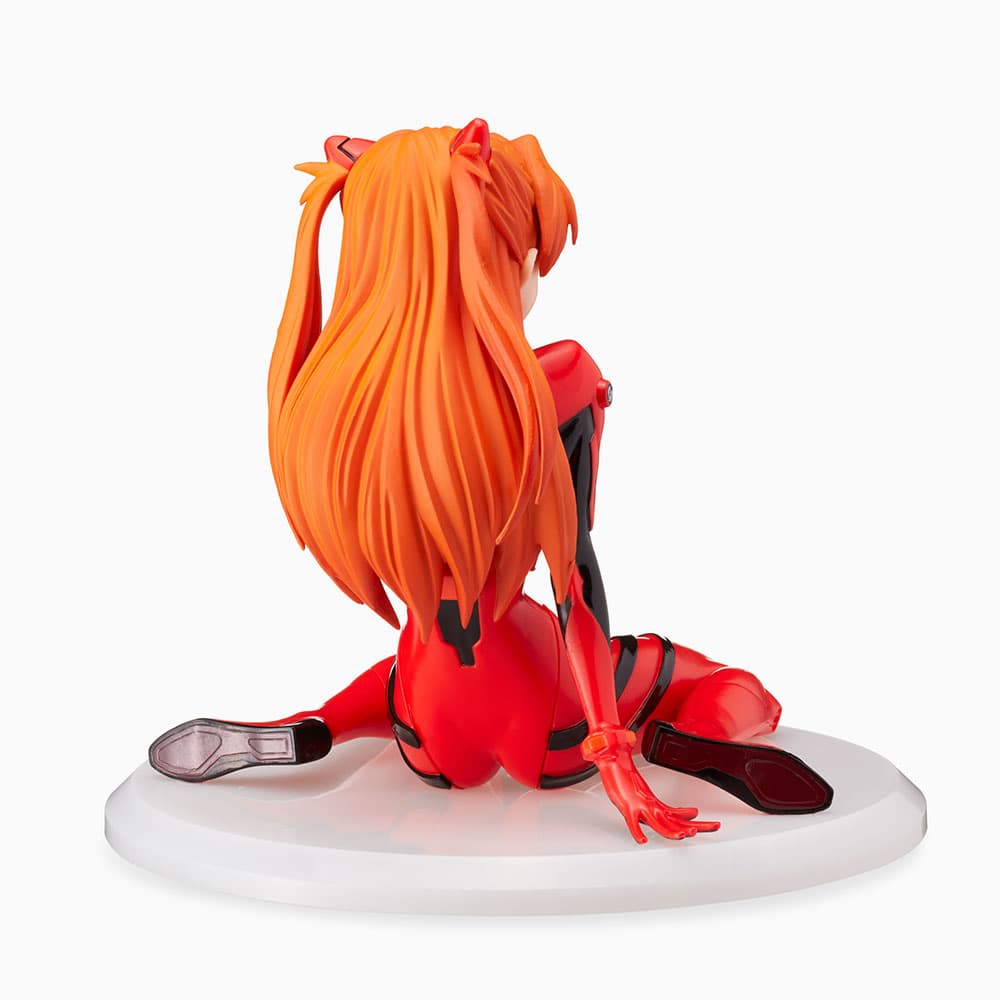 La figura nos muestra al personaje Asuka vistiendo su traje de piloto rojo mostrado en el anime. Asuka se encuentra sentada en forma de W, mientras sostiene el equilibrio con la mano derecha, ocupa su mano izquierda para mostrarnos el lado tierno que posee el personaje.