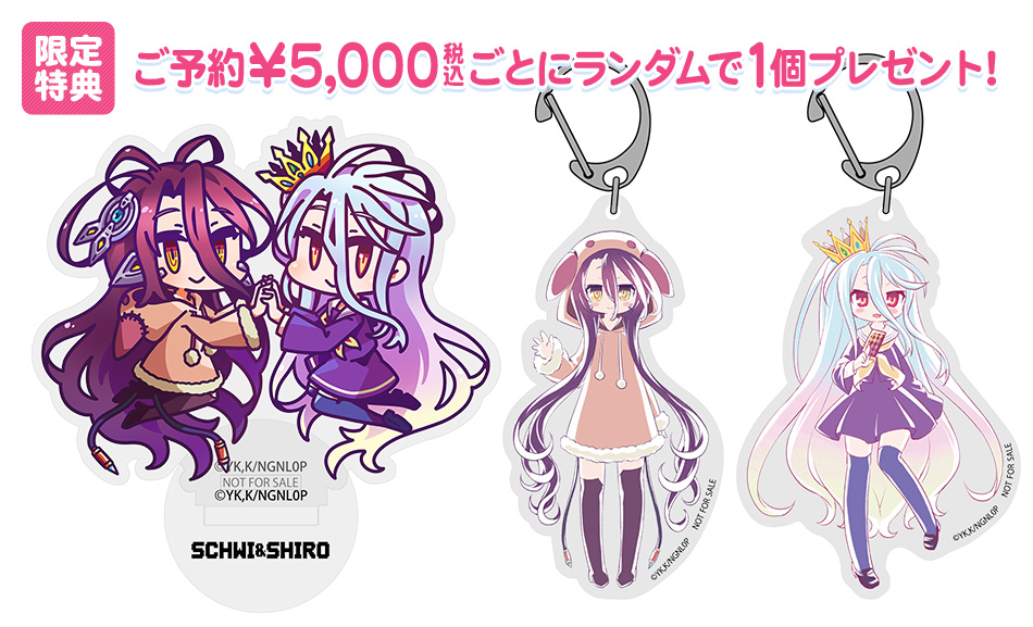 El popular anime isekai No Game no Life está de regreso en una colaboración con la cadena Nijigen Cospa para lanzar a la venta una línea de productos inspirados en las tan queridas heroínas Schwi y Shiro. Entre la mercancía podemos apreciar acrílicos de gran tamaño, anillos de plata, tazas con estampados, llaveros de acrílico, etc.