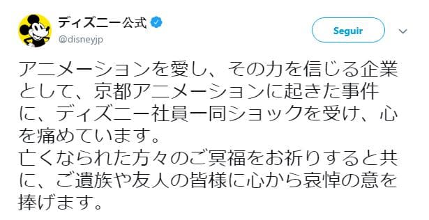 Disney Japan por medio de su cuenta oficial de Twitter publicó un comunicado breve en apoyo a las víctimas y al estudio Kyoto Animation.