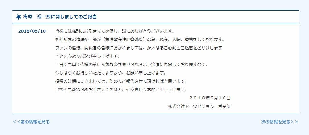 Ahora la empresa de gestión de talentos anunció que el actor de voz Yuichiro Umehara fue dado de alta del hospital. La agencia dijo que Umehara regresará lentamente al trabajo, y que tendrán en cuenta su condición física actual para no sobre cargarlo de trabajo y evitar un empeoramiento de la salud de Umehara.