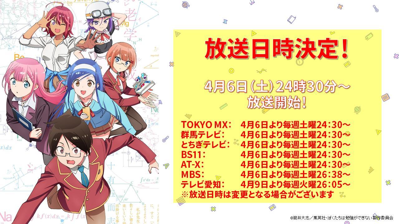 La adaptaciรณn anime del manga Bokutachi wa Benkyou ga Dekinai acaba de revelar una imagen promocional, la cual confirma la fecha en la que serรก emitido el primer episodio del anime. El anime se estrenarรก el 6 de abril.