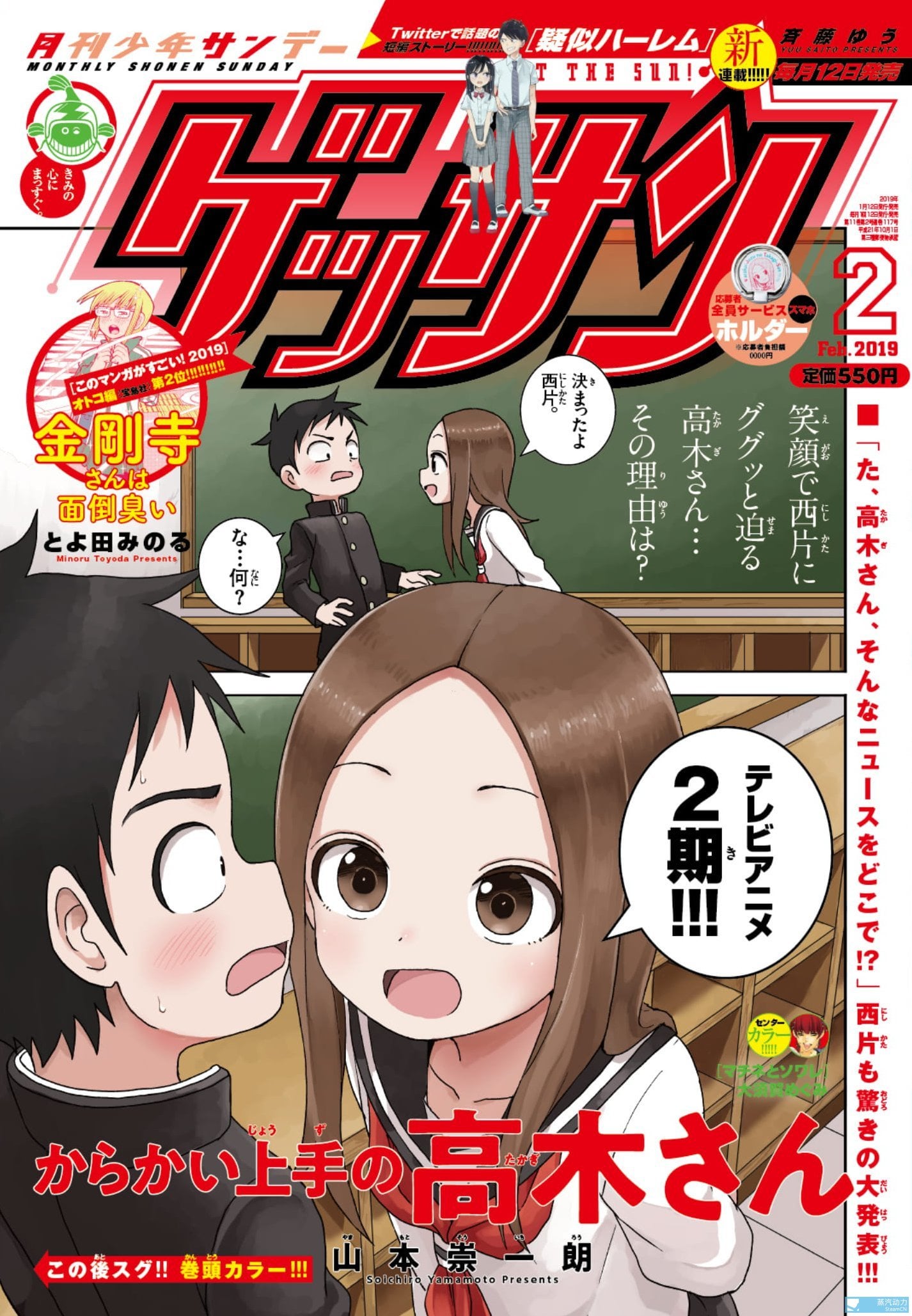 Yamamoto lanzó el manga en Gessan mini, el folleto que acompaña a Gessan (Monthly Shonen Sunday) en 2013. Después de que Yamamoto terminara de serializar su manga Fudatsuki no Kyōko-chan en Gessan en junio de 2016, Teasing Master Takagi-san se mudó a Gessan en julio de 2016.