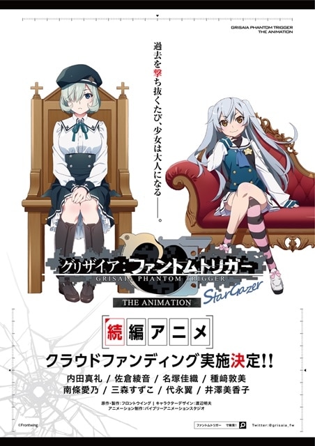 El anime Grisaia: Phantom Trigger Stargazen, la segunda temporada de esta nueva saga, consiguió su meta de Crowdfunding en menos de 24 horas. Su objetivo, de 10 millones de yenes (92.000 US$) empezó el 26 de julio y terminará el 30 de septiembre, llevando en solo 5 días mas de 15 millones de yenes recaudados.