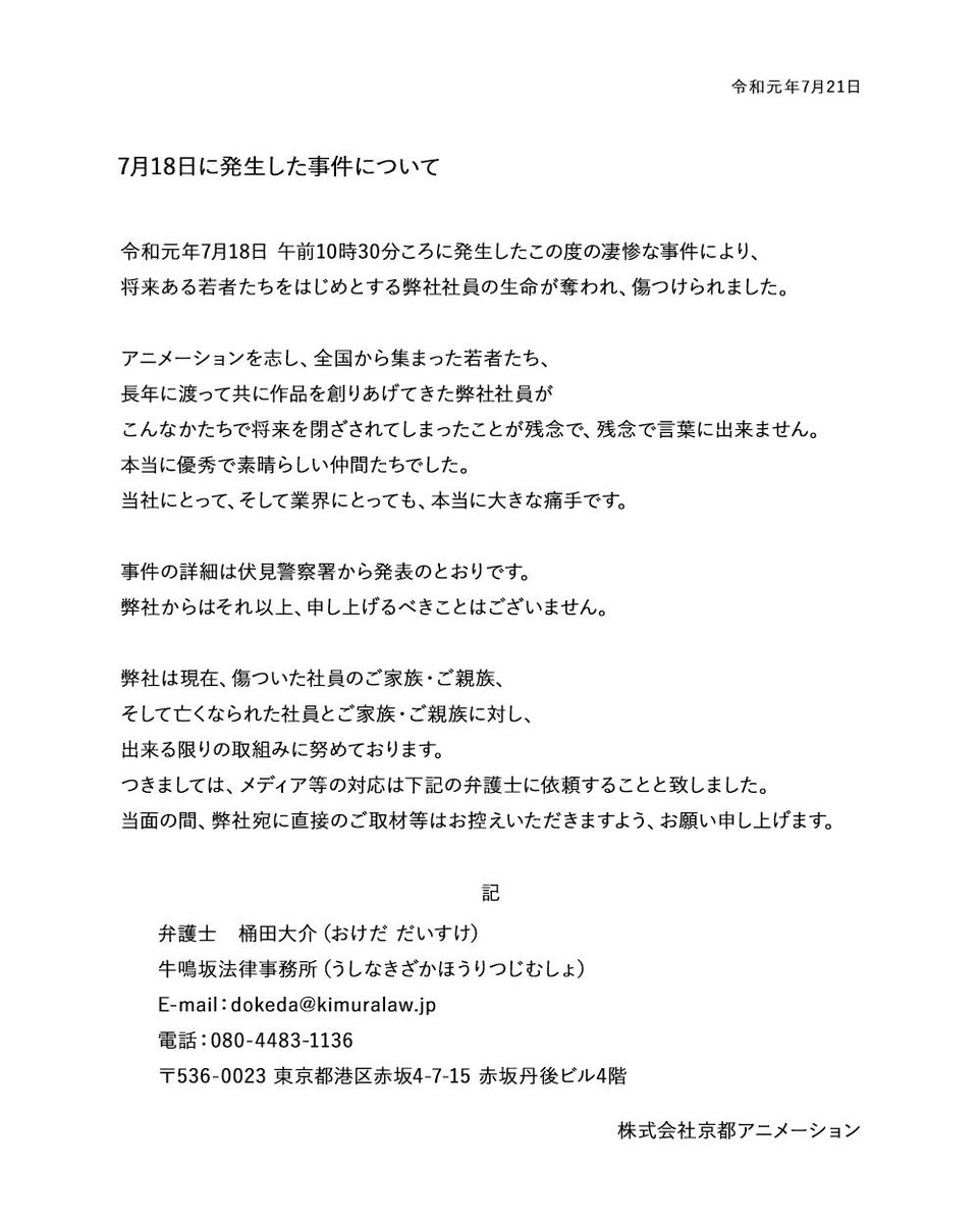 Con su gran pasión por crear animes, nuestros jóvenes animadores han llegado de todas partes de Japón, junto con veteranos que han trabajado con nosotros durante muchos años, pero su futuro ha sido cortado lamentablemente y es imposible encontrar las palabras adecuadas para expresarlo. Eran colegas y amigos realmente increíbles, talentosos y muy queridos. Este es un golpe devastador para Kyoto Animation y para la industria de la animación.