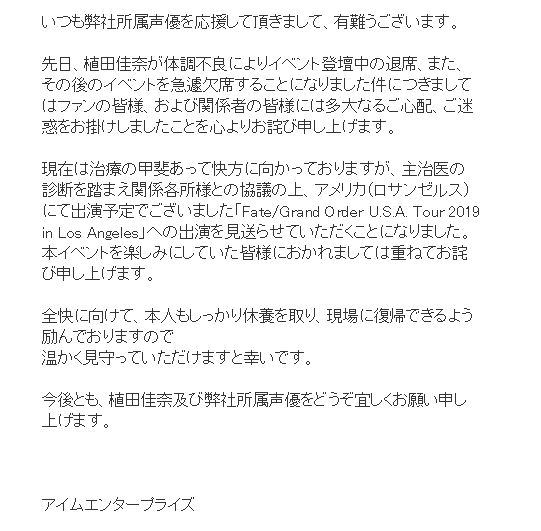 La agencia de talentos I’m Enterprise anunció en el blog oficial de la actriz de voz Kana Ueda que Ueda fue hospitalizada después de tener que retirarse de un evento el jueves debido a su mala salud.