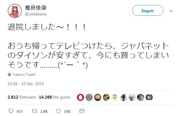 La seiyuu Kana Ueda ha revelado en su cuenta de Twitter que ha sido dada de alta del hospital después de ser hospitalizada el día de ayer. Ueda también dijo en su blog oficial que su condición física está mejorando y que está regresando a su vida normal.