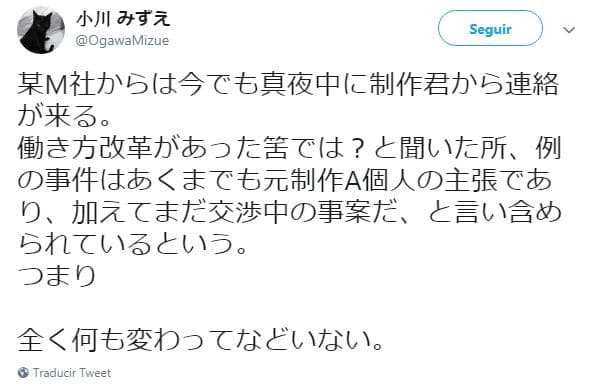 Segรบn la animadora independiente Mizue Ogawa, las cosas no han cambiado en Madhouse. En un tweet publicado el lunes, escribiรณ: ยซRecibรญ la noticia de un asistente de producciรณn de cierto estudio ‘M’ de que รฉl todavรญa trabaja hasta la madrugada ยฟNo se suponรญa que habรญa cambios sobre las condiciones laborales?, lo que comento es simplemente la afirmaciรณn del ex asistente de producciรณn. El asunto es que esto todavรญa estรก en medio de negociaciones. En otras palabras nada ha cambiado.ยป.