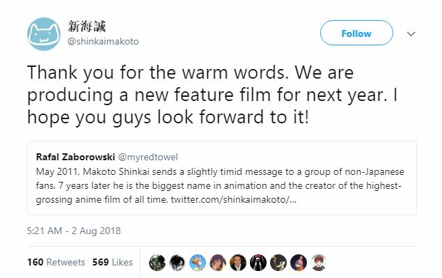El director Makoto Shinkai ha revelado en su cuenta de Twitter que está trabajando en una nueva película que se estrenaría el próximo año.