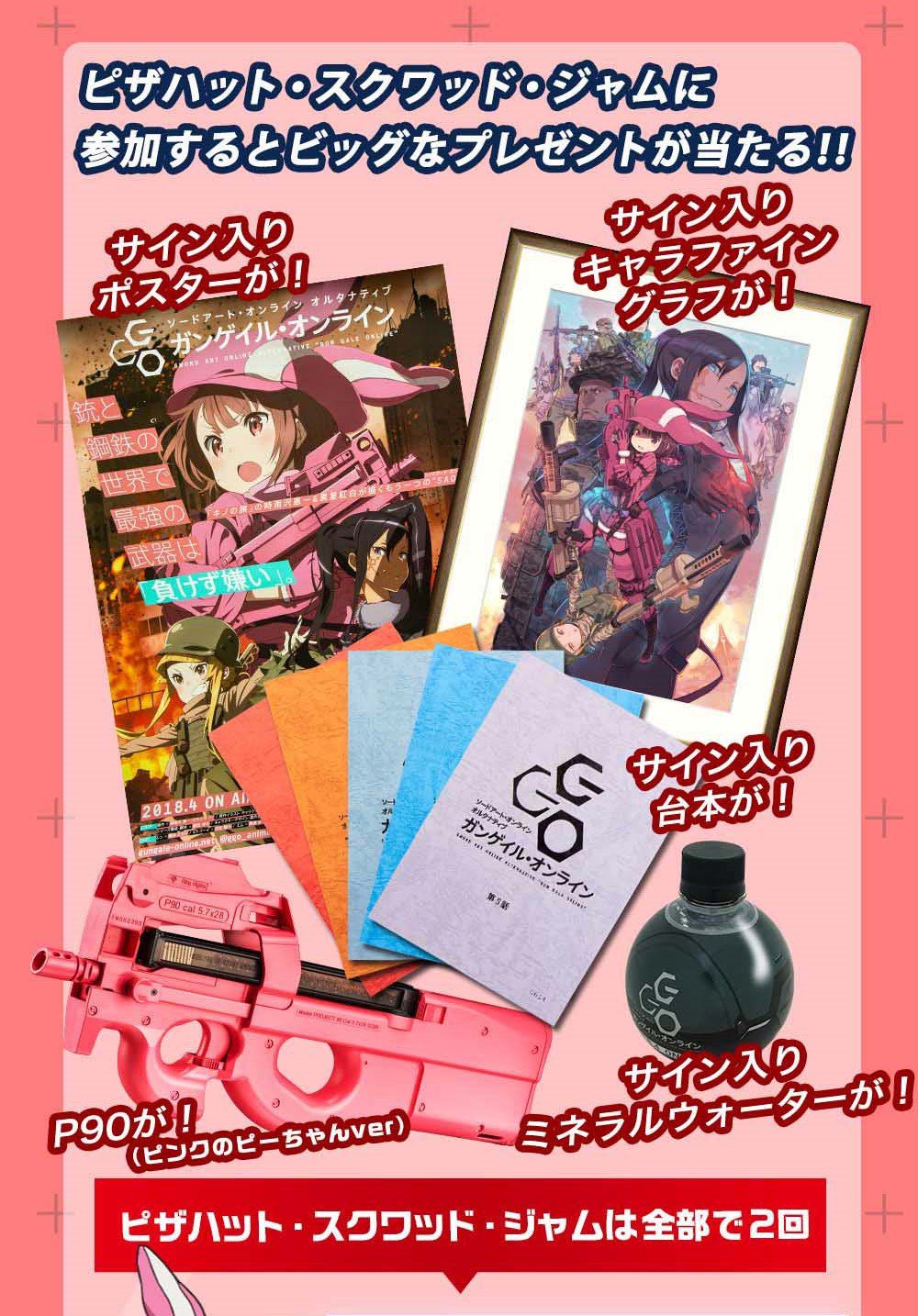 El segundo Squad Jam tiene incluso más premios. Los fans pueden iniciar sesión en elsitio web de Pizza Hut y durante la comprobación de su orden, pueden agregar el «inscripción en Gun Gale Online» para para tener la oportunidad de ganar una de las tres ilustraciones originales firmadas por el autor Keiichi Sigsawa y el artista Kouhaku Kuroboshi , una secuencia de episodios autografiados por Tomori Kusunoki y la actriz de voz de Pitohui, Yōko Hikasa , una réplica de la P90 rosa de Llenn o una gran botella de agua mineral con envase en forma de granada de plasma firmada por Kusunoki.