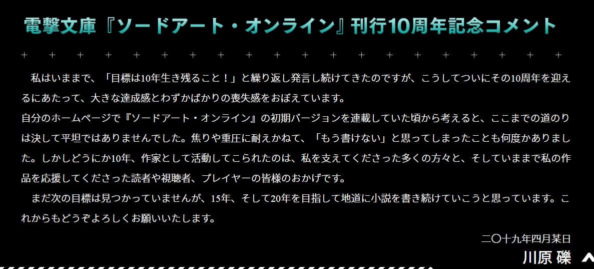 Repetí una y otra vez que «¡mi meta era sobrevivir durante 10 años!» pero ahora que he alcanzado esa meta, tengo un nuevo logro con un ligero sentimiento de pérdida. El camino desde la primera vez que comencé a escribir Sword Art Online en mi sitio web nunca fue difícil. Cuando sentí que no podía superar el dolor y la presión, hubo varias veces que pensé: «No puedo seguir escribiendo». Pero de alguna manera he escrito durante 10 años, gracias a los lectores, espectadores y gamers que me han apoyado hasta ahora. Aún no he establecido mi próximo objetivo, pero seguiré escribiendo novelas de manera constante durante 15 o incluso 20 años. ¡Gracias de antemano!