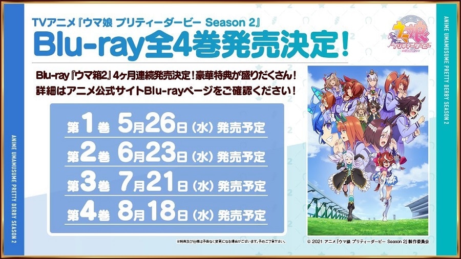 Se anunció que la segunda temporada del anime «Uma Musume Pretty Derby» contará con un total de 13 episodios que serán recopilados en cuatro volúmenes Blu-ray. La serie está programada para estrenarse en Japón a partir del 4 de enero.