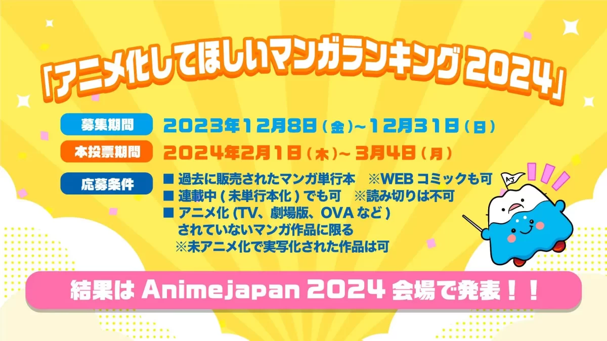 Como parte de los eventos que se realizan durante cada edición de la AnimeJapan, se encuentra la conocida votación en la que los fanáticos pueden nominar sus mangas favoritos con la ilusión de que el comité ejecutivo los considere como proyectos a futuro y logren obtener una adaptación animada. La votación ha sido llamada “Ranking de Manga 2024 que queremos que se convierta en anime”.