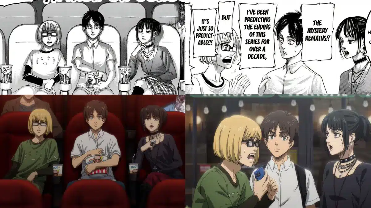 Gracias a las redes sociales ha estado circulando estas imágenes que nos dejan ver sobre qué se trata. En ellas podemos ver a Armin, Eren y Mikasa en una sala de cine vestidos con unos atuendos informales, mientras que en la segunda vemos a los 3 protagonistas charlando. Esto ha causado varias reacciones entre los fans, la primera es que el atuendo «gótico» de Mikasa ha sido muy bien aceptado por los fans de «Attack on Titan».