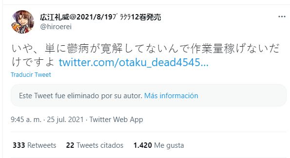 Rei Hiroe respondió a los mensaje de apoyo de la comunidad y reveló que durante los últimos 10 año ha estado luchando contra una depresión, por lo que trabajar es difícil para él, pero está haciendo todo lo posible para avanzar en el desarrollo de su manga.