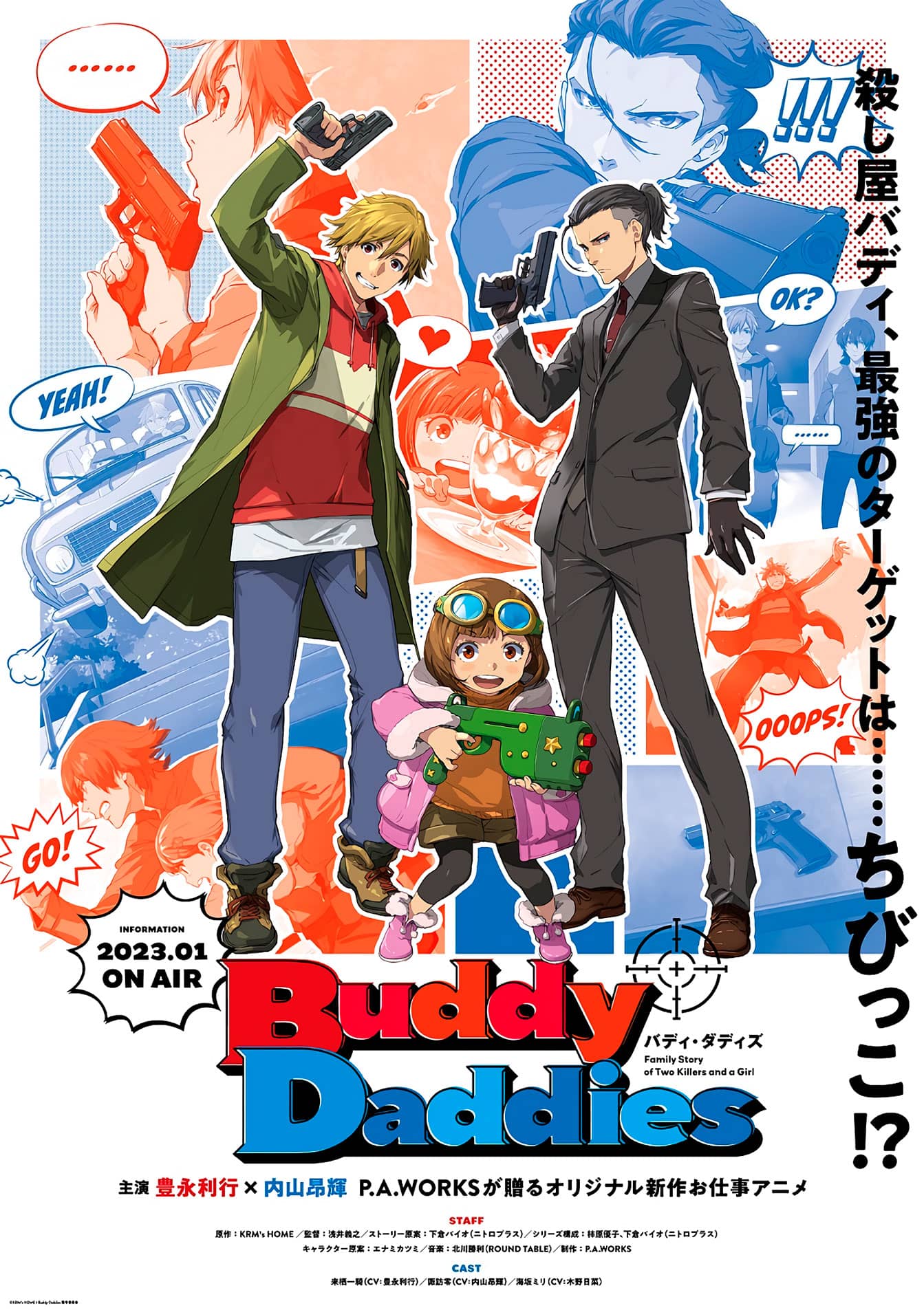 De manera adicional, en el sitio web oficial del anime Buddy Daddies se ha publicado la primera imagen visual de la serie y se presentó a los primeros integrantes del elenco de voz junto a los respectivos visuales de los personajes que interpretarán y a los miembros del staff que ayudaran en la producción de la serie.