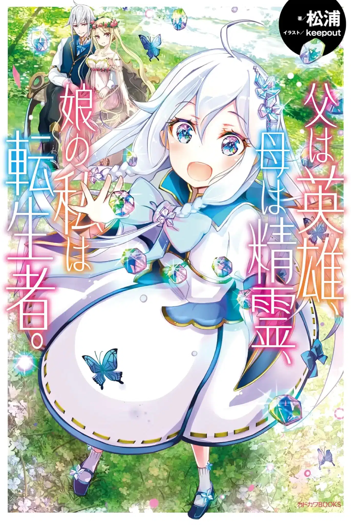Chichi wa Eiyuu, Haha wa Seirei, Musume no Watashi wa Tenseisha es una novela ligera isekai escrita por Matsuura e ilustrada por keepout. Esta novela comenzรณ a publicarse en la imprenta Kadokawa Books de la editorial Fujimi Shobo (KADOKAWA) desde marzo de 2016, llegando a su final en octubre de 2022. Chichi wa Eiyuu, Haha wa Seirei, Musume no Watashi wa Tenseisha contรณ con un total de 9 volรบmenes publicados.