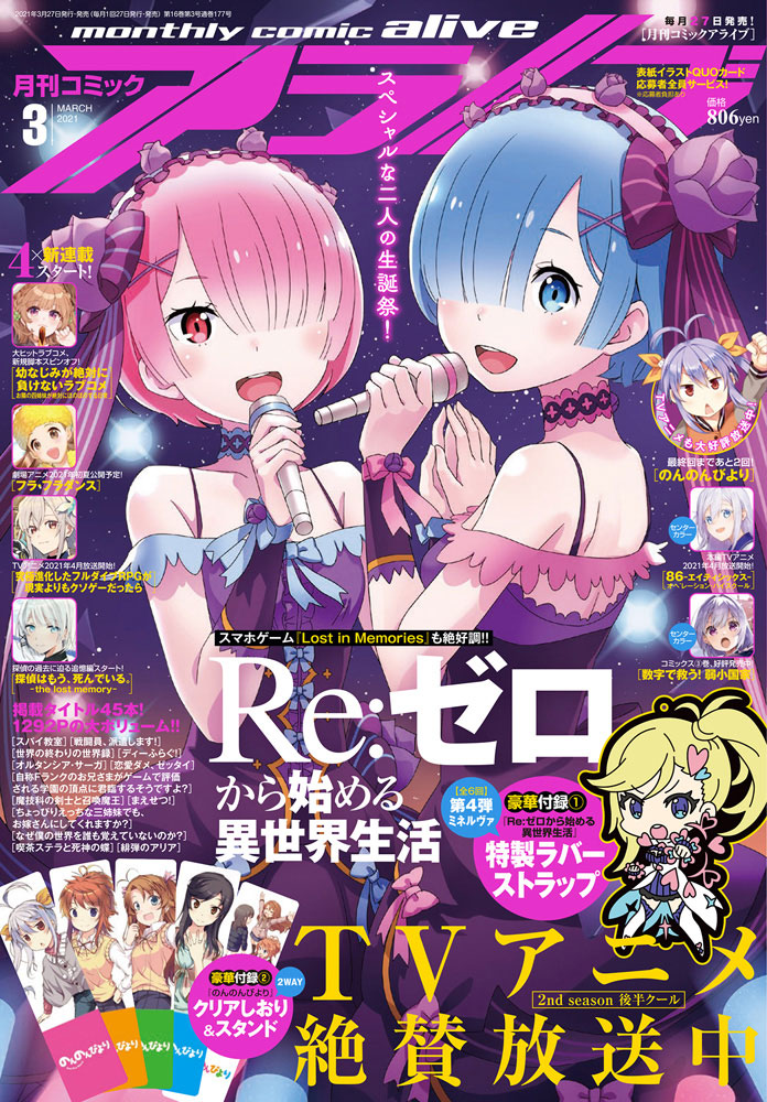 Este anuncio se realizo en el sitio web oficial de la compañía Kadokawa, en el cual se revelaba el contenido de la edición de marzo de su revista mensual «Comic Alive«. La portada de la revista usa una ilustración de las personajes Rem y Ram en conmemoración a su cumpleaños.