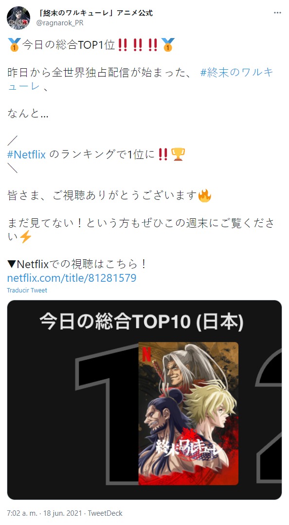 Mediante la cuenta oficial en Twitter para la franquicia multimedia Shuumatsu no Valkyrie (Record of Ragnarok) se dio a conocer la noticia de que la animación recién estrenada en Netflix se posicionó en el top 1 del ranking general.