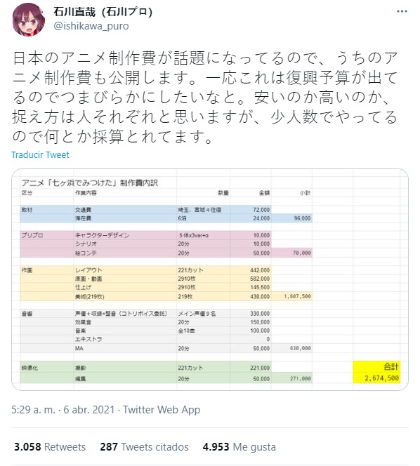 Sin embargo, no fue hasta el pasado 6 de abril que el director de animación Naoya Ishikawa hizo público mediante su cuenta de twitter los costos de producción del cortometraje.