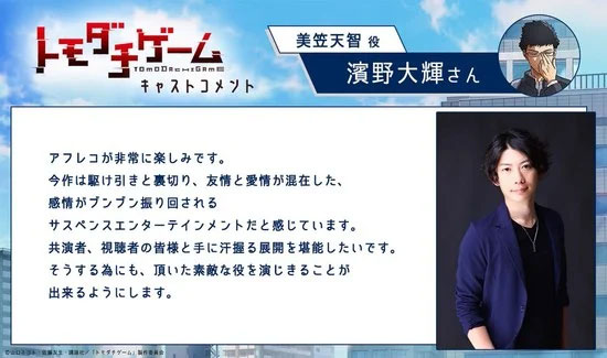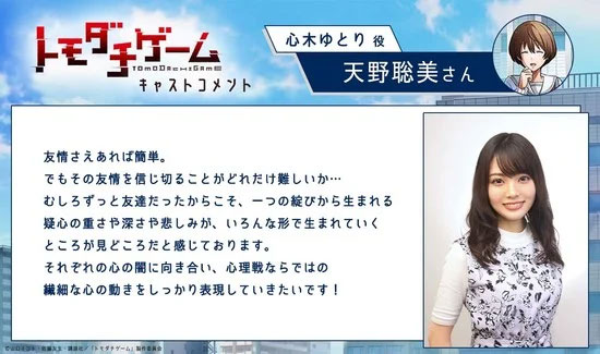 De manera adicional, en el Twitter oficial del anime Tomodachi Game también se reveló a los miembros del elenco de voz y miembros del staff encargado de la serie.