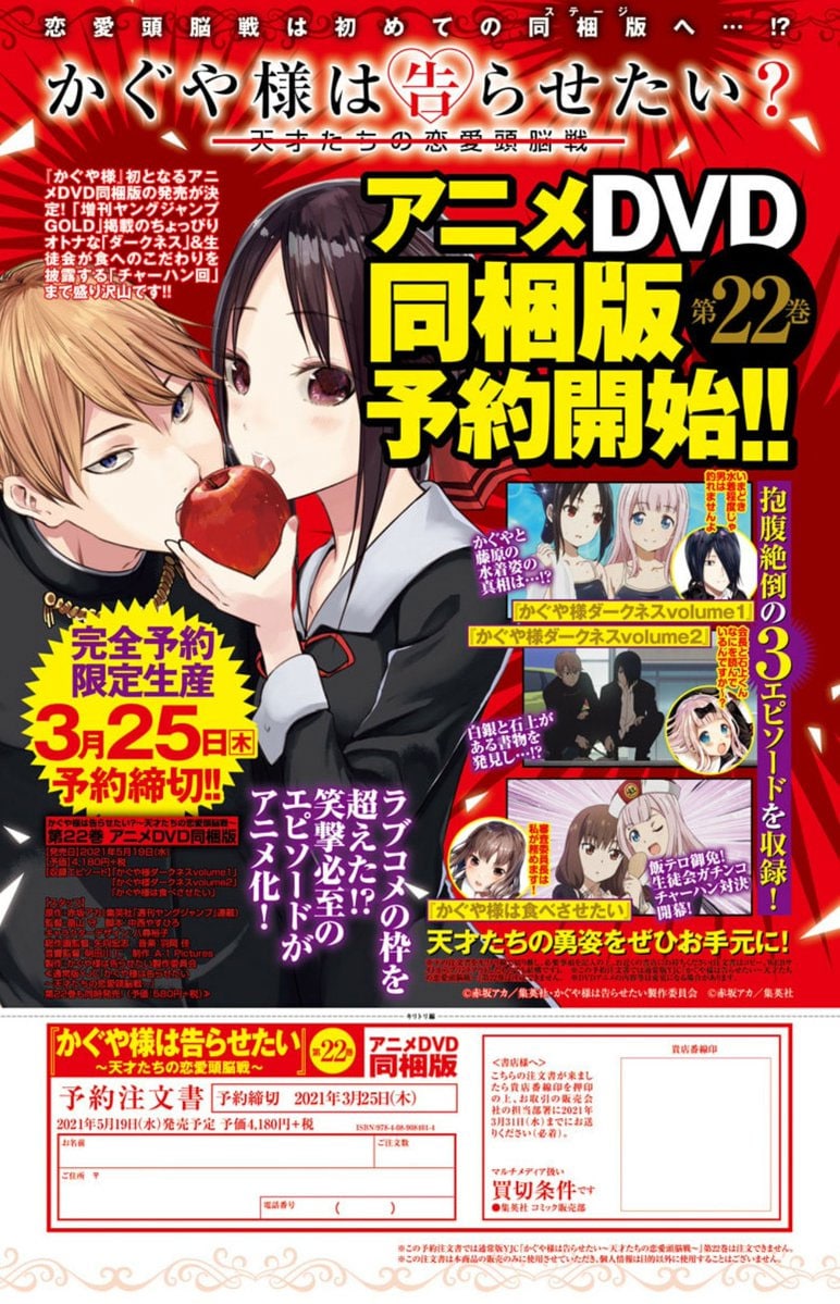 A través de la cuenta oficial de Twitter se anunció este jueves que el 22º volumen de Kaguya-sama: Love is War incluirá el OVA en formato DVD a partir del 19 de mayo.