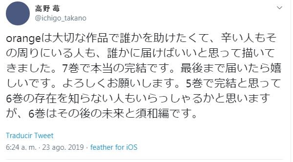 El mangaka Ichigo Takano reveló en Twitter el jueves que el séptimo volumen de su manga Orange será el verdadero volumen final del manga.