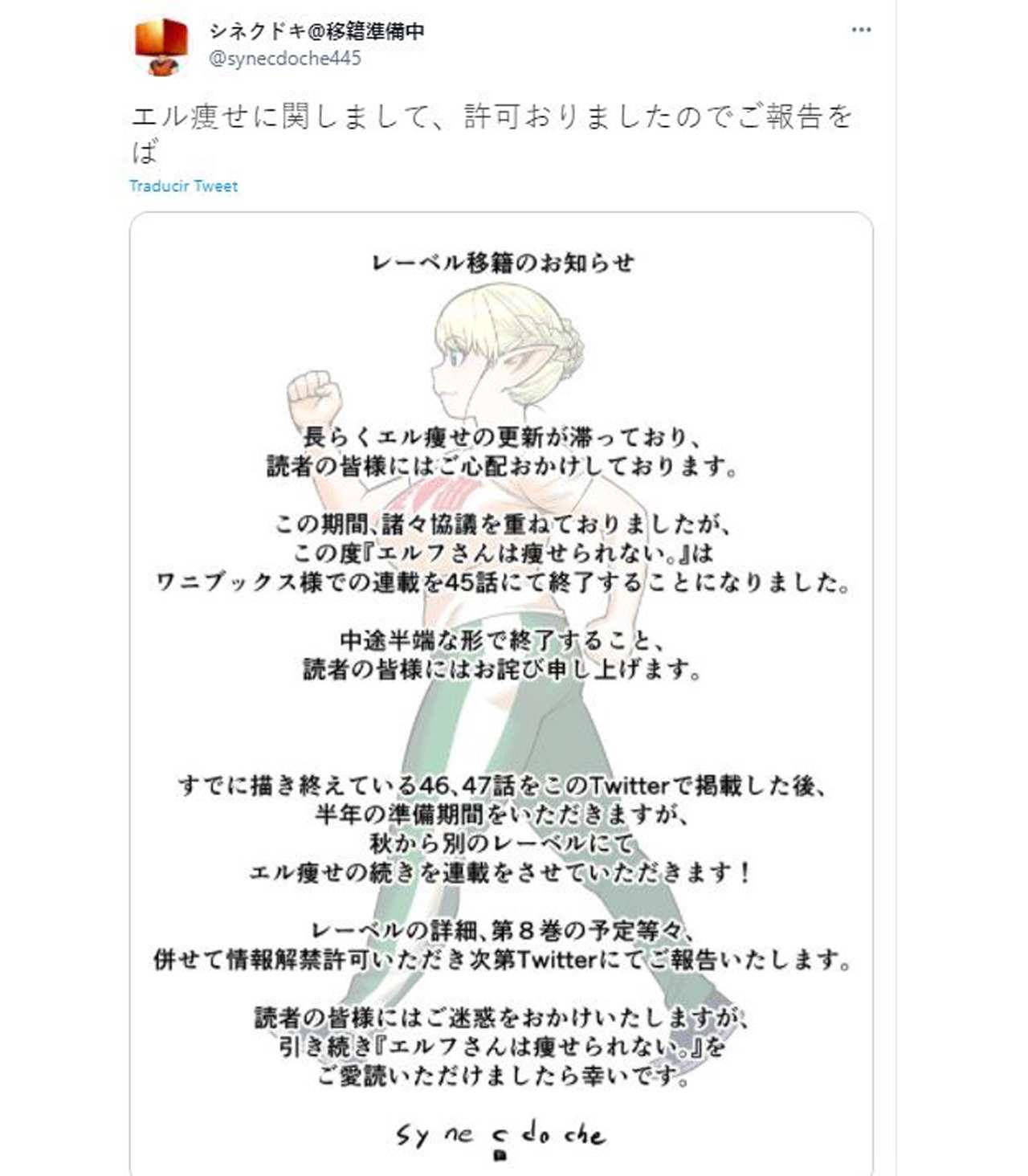 Mediante su cuenta de Twitter oficial del autor del manga Elf-san wa Yaserarenai (Plus-Sized Elf) Synecdoche, anunció el pasado viernes que la editorial Wani Books ya no publicará su manga. La editorial Wani Books publicó el capitulo 45 del manga, mientras que Synecdoche publico el capitulo 46 y próximamente el capitulo 47, después de emitirse este ultimo el manga tendrá una pausa de medio año para cambiar de editorial.