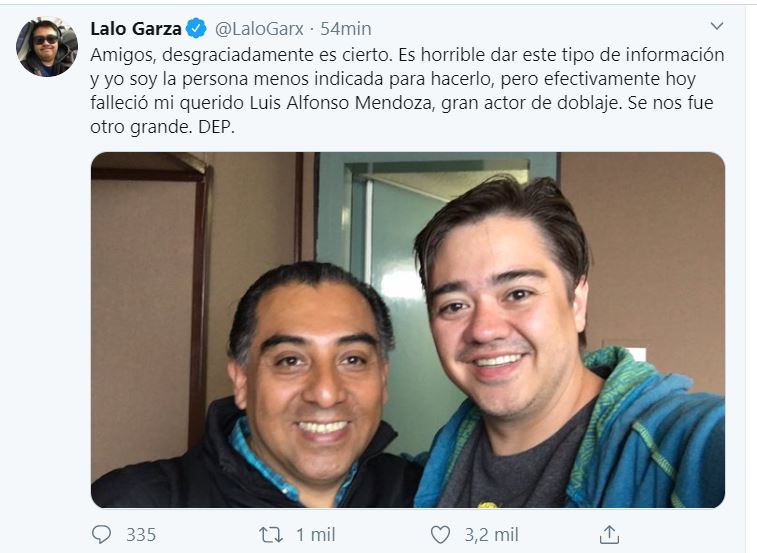 Ante el rumor sobre el fallecimiento de Luis Alfonso Mendoza, diferentes figuras de la industria del doblaje en Latinoamérica han confirmado por medio de sus redes sociales la defunción del actor. Tal es el caso de Lalo Garza, quien por medio de su cuenta de Twitter oficial confirmó el fallecimiento de Luis hace unos instantes.