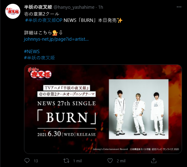 Pero eso no es todo, también se reveló el Opening titulado «BURN», el cual estará interpretado por el grupo NEWS.
