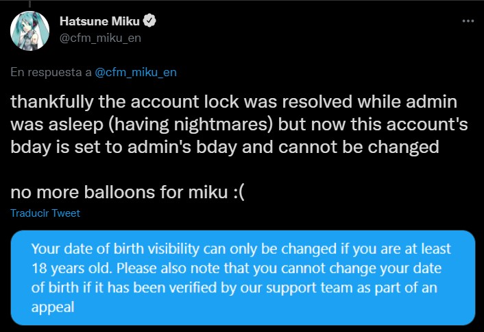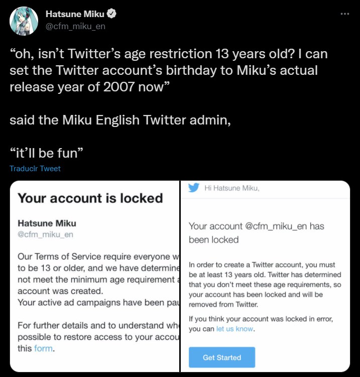 A travรฉs del Twitter oficial de Hatsune Mikuย se revelรณ la suspensiรณn de su cuenta debido a que no cumplรญa con los requerimientos de edad de la plataforma.