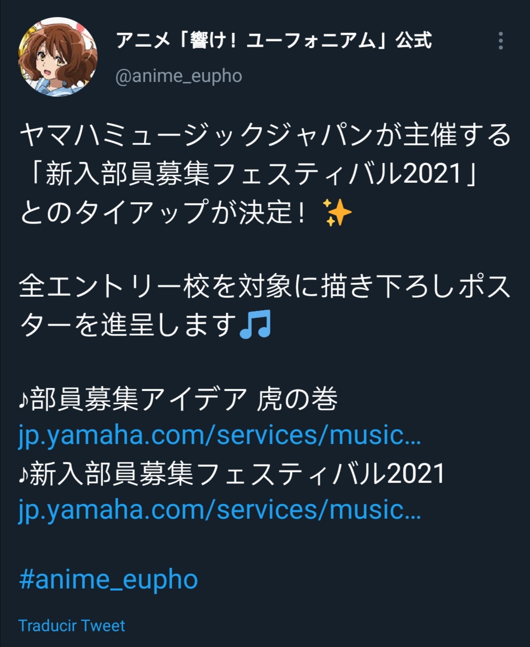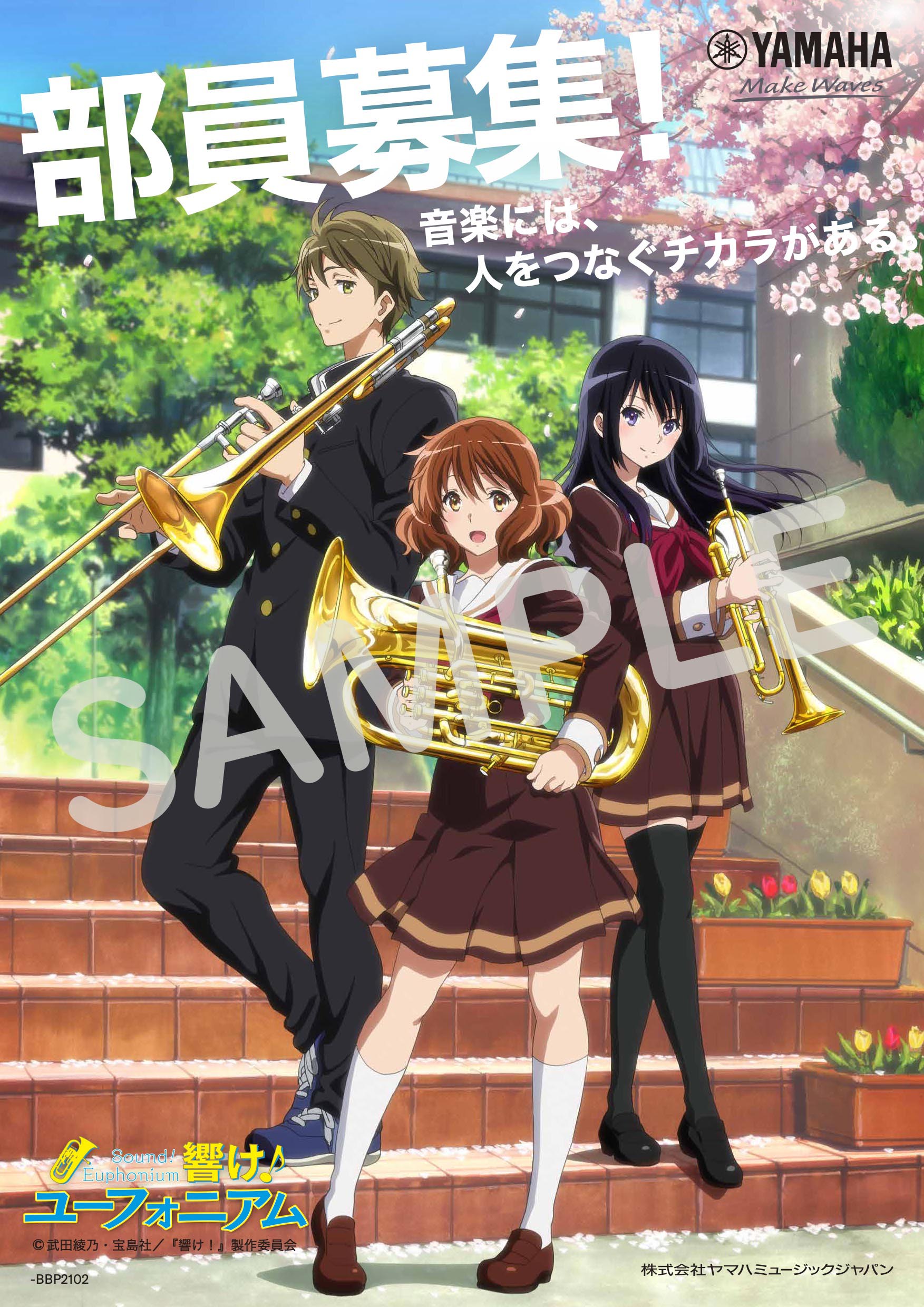 Mediante el Twitter oficial del anime Hibike! Euphonium se hizo oficial la colaboración que tendrá con la marca Yamaha. Esta iniciativa tiene por objetivo ayudar a las escuelas secundarias y preparatorias de Japón con el reclutamiento de nuevos miembros para las bandas. Las maneras para el reclutamiento serán virtuales así como presenciales cumpliendo los protocolos de seguridad.