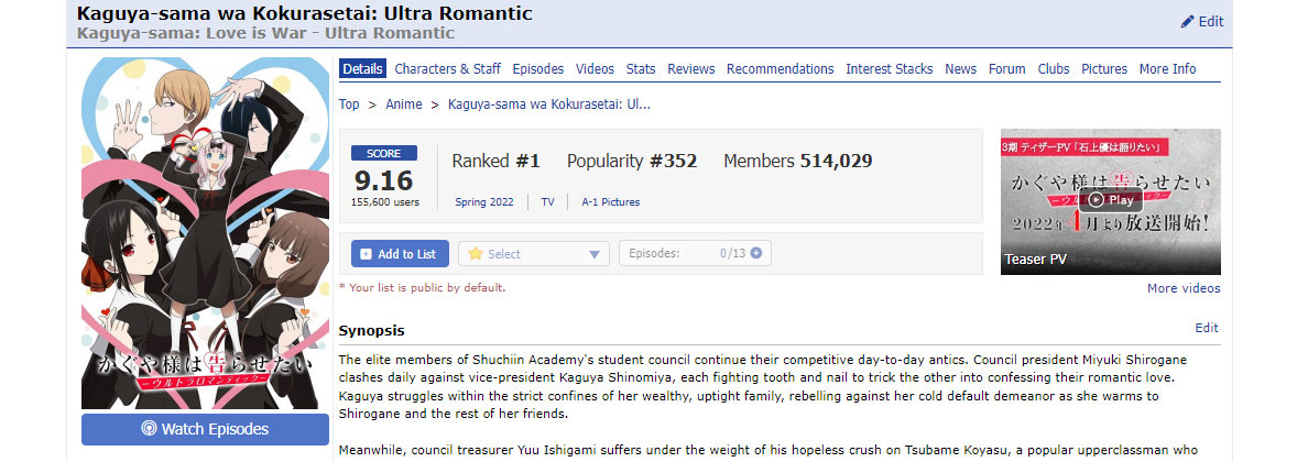 Kaguya-sama: Love is War -Ultra Romantic- es el anime mejor calificado de MyAnimeList