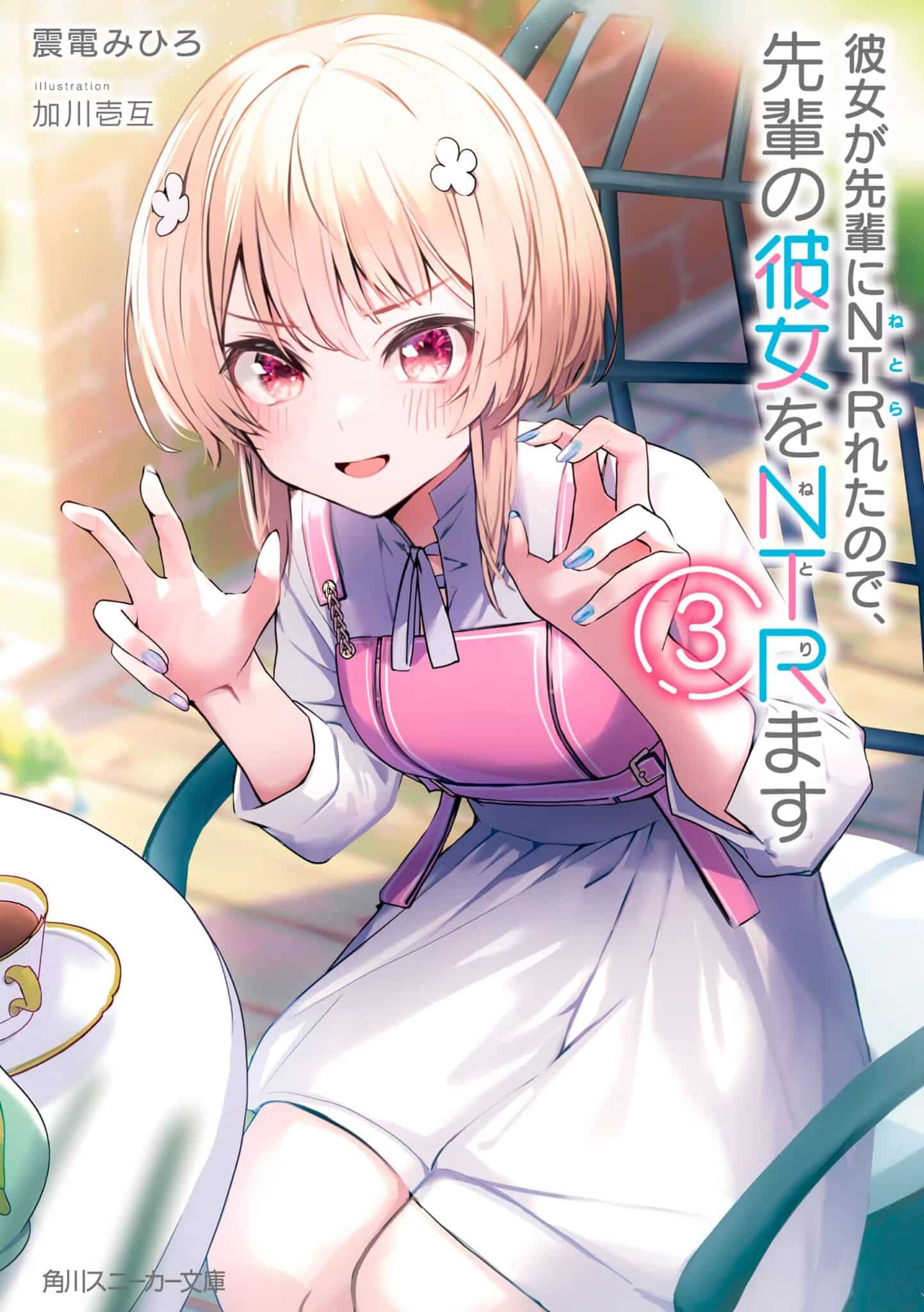 En el sitio web oficial del sello editorial Kadokawa Sneaker Bunko, la novela ligera Kanojo ga Senpai ni NTR-reta no de, Senpai no Kanojo wo NTR-masu (My Girlfriend was NTR’d by My Senior, so I’ll NTR My senior’s Girlfriend) reveló la portada oficial de su tercer volumen y se confirmó que este volumen que se lanzará a la venta en las tiendas de Japón el próximo 1 de noviembre de este año y estará disponible bajo un precio de 726 yenes.