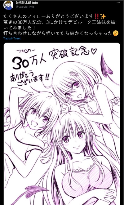Ahora bien, a tan solo dos días de su apertura, alcanzó la cifra de 300 mil seguidores, para conmemorarlo, realizó una hermosa ilustración de la franquicia To Love-Ru.