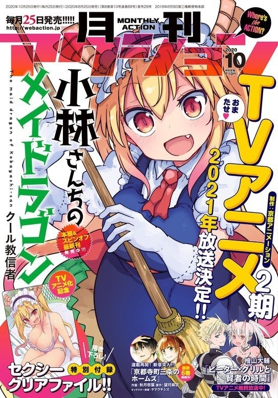 Con el objetivo de promocionar el anuncio de la segunda temporada de la adaptación al anime del manga Kobayashi-san Chi no Maid Dragon (Miss Kobayashi’s Dragon Maid), la revista Monthly Action, revista donde se publica la obra en Japón, ha preparado una sorpresa especial para los fanáticos de esta franquicia y es que la Maid Dragona Tohru protagonizará la edición de Octubre de 2020 de la revista.