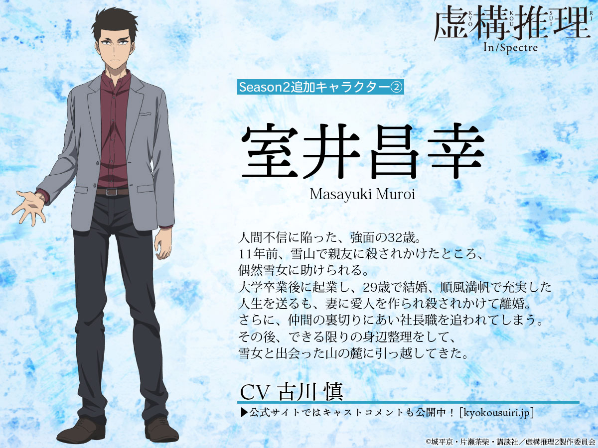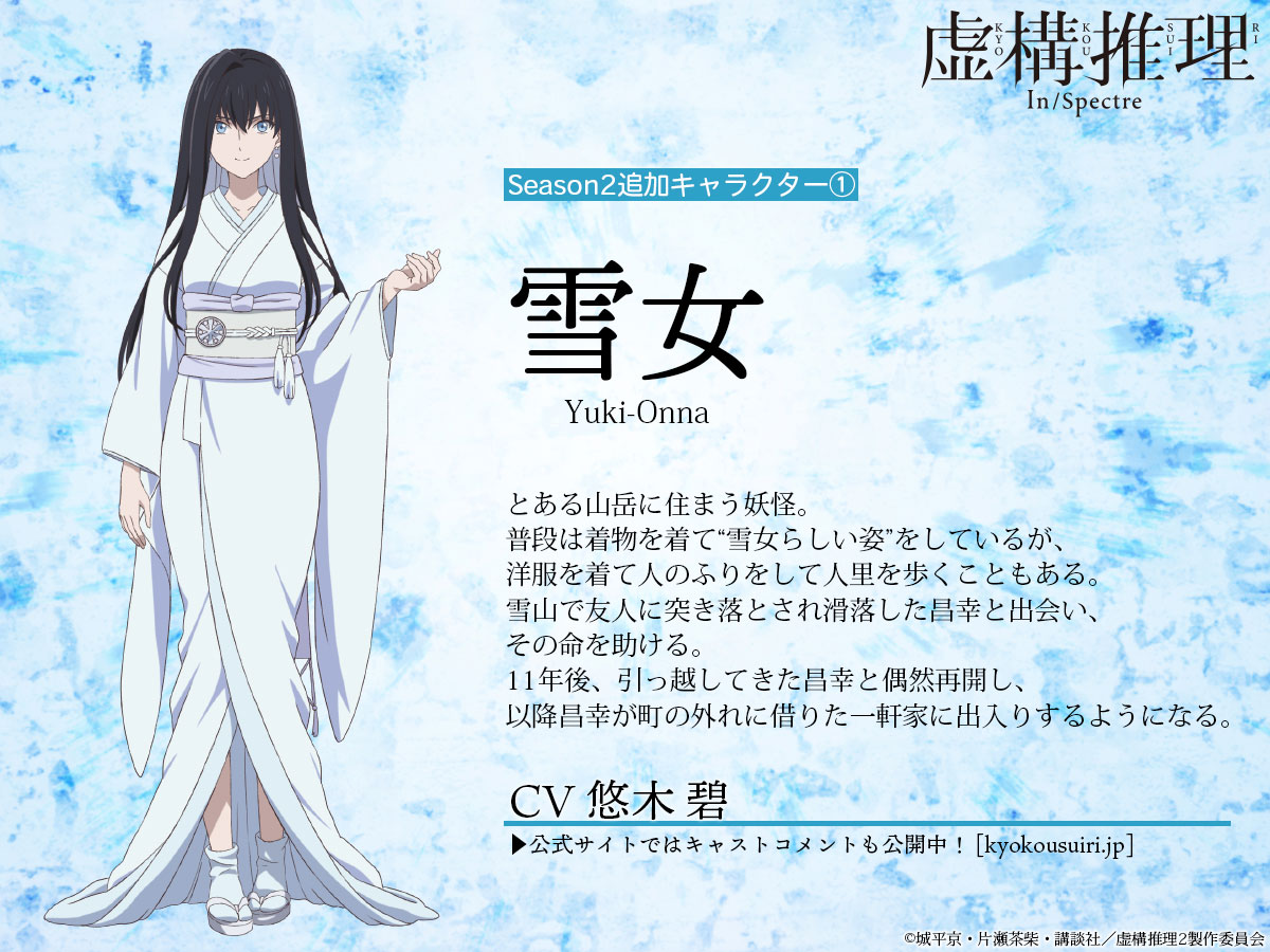 Pero eso no es todo, ya que el anime Kyokou Suiri anunció que Makoto Furukawa y Aoi Yuuki se encargarán de interpretar a los personajes Masayuki Muroi y Yuki-Onna. Adicionalmente, se han publicado los diseños de ambos personajes.