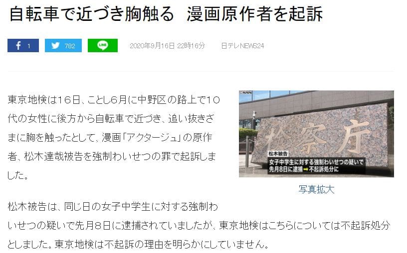 La Fiscalía del Distrito de Tokio ha acusado a Tatsuya Matsuki, autor original del Act-Age, de agredir a una adolescente en bicicleta por la espalda y tocarle el pecho en las calles del barrio Nakano en junio.