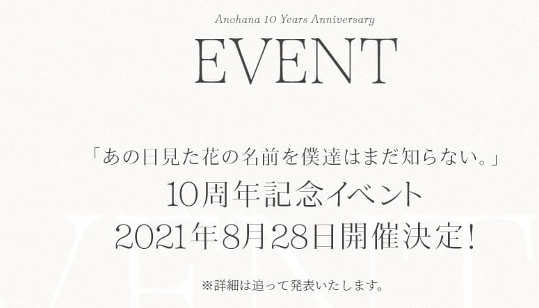 En celebración por el décimo aniversario del anime original «AnoHana«, se anuncio el lanzamiento de un nuevo proyecto animado relacionado con la franquicia. Un sitio web ha sido revelado al publico, y se presento la primera imagen visual del proyecto animado.
