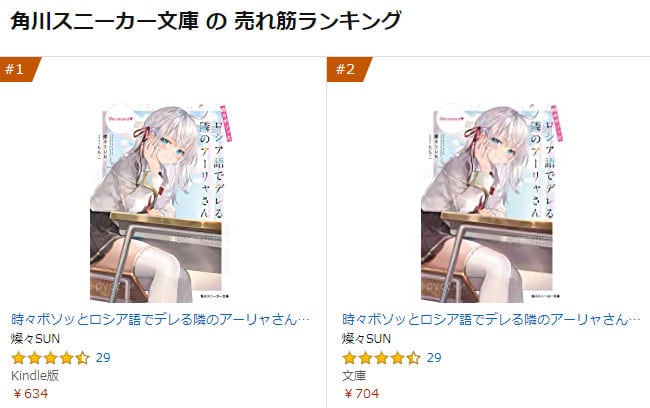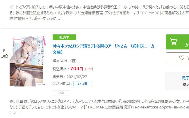 A través de la cuenta de Twitter oficial para la novela ligera Tokidoki Bosotto Roshia-Go de Dereru Tonari no Arya-San se reporto que el primer volumen de la obra se ha posicionado en los primeros puestos en las diferentes librerías digitales de Japón
