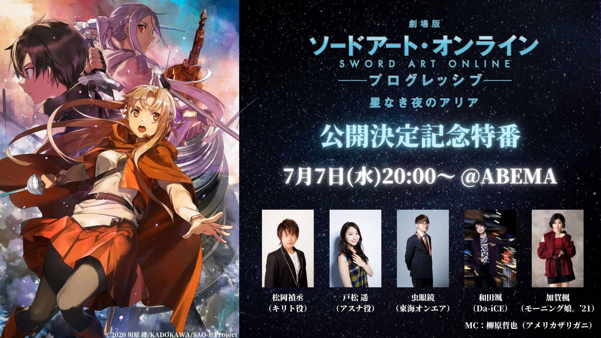 A través del twitter oficial para la franquicia Sword Art Online, el staff para la película Sword Art Online: Progressive – Hoshi Naki Yoru no Aria anunció que se realizará una transmisión especial el próximo 7 de julio en la plataforma japonesa ABEMA.
