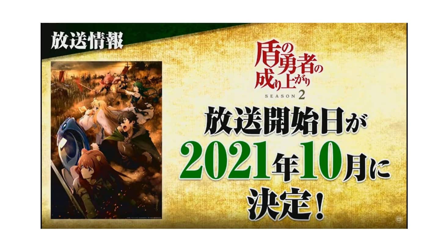 A través del sitio web oficial para la adaptación a anime de la novela ligera Tate no Yuusha no Nariagari (The Rising of the Shield Hero), se ha anunciado que la segunda temporada de la serie se estrenará en el mes de octubre del año 2021.