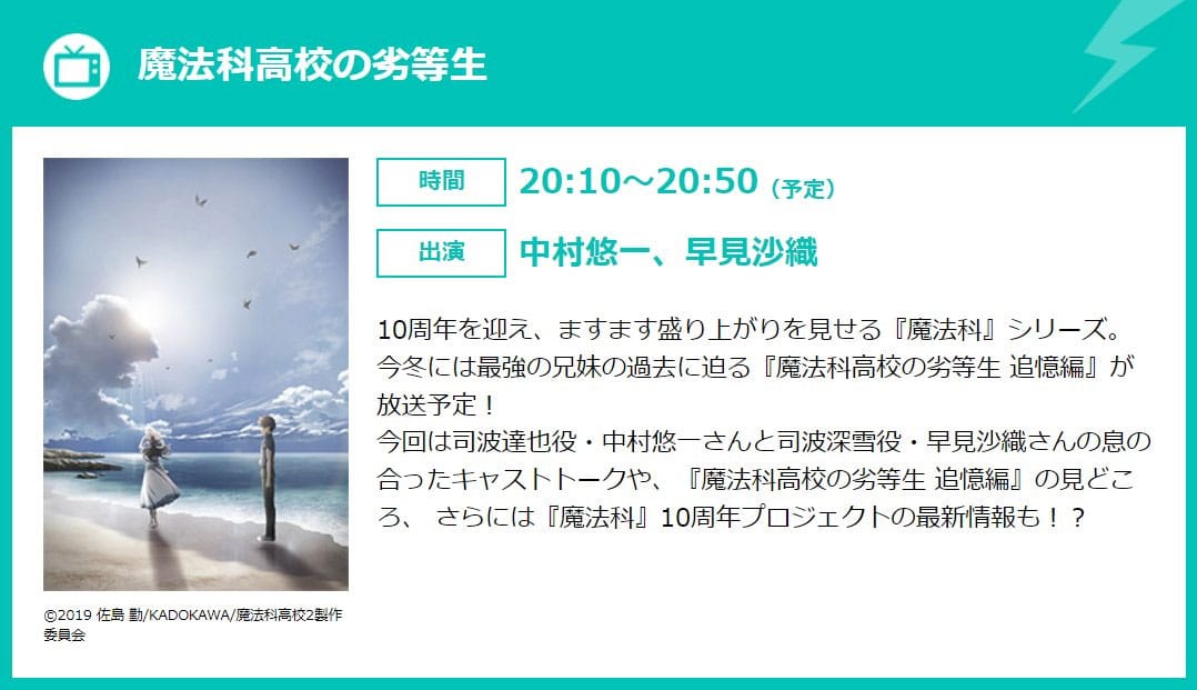El evento «Dengeki Bunko Winter Festival Online 2021» se realizará el próximo 12 de diciembre y Yuuichi Nakamura (voz de Tatsuya Shiba) y Saori Hayami (voz de Miyuki Shiba). Hace unos días, se reportó que el anime Mahouka Koukou no Rettousei: Tsuioku-Hen se estrenará en Japón este 31 de diciembre.