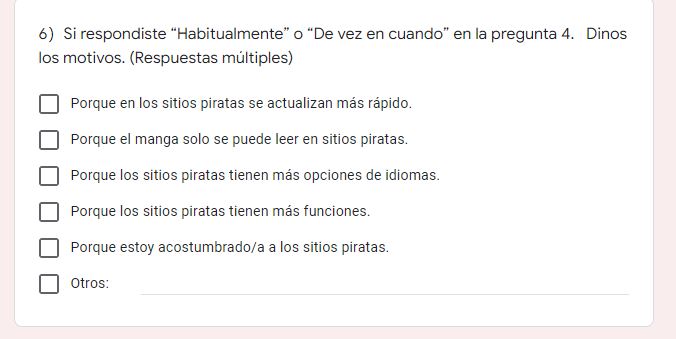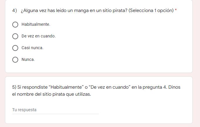 No sabemos si la pregunta sea para conocer los nombres de los sitios de este tipo y así cerrarlos o quizás también sea una manera de mejorar su servicio y así evitar que los lectores consuman manga pirata, pues la encuesta continua con preguntas de esa índole.