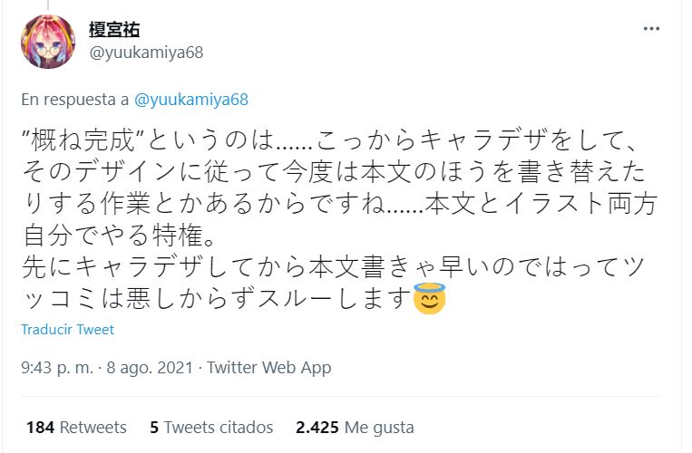 El autor de la serie de novelas ligeras No Game No Life, Yuu Kamiya, reveló por medio de su cuenta de Twitter personal que el volumen 11 ya está casi terminado y solo faltan dibujar las ilustraciones.