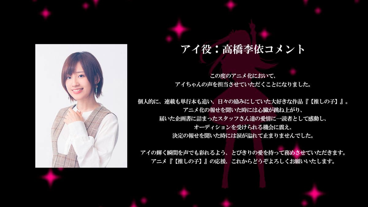 De manera adicional, se anunció que la actriz de voz Rie Takahashi se encargará de interpretar al personaje Ai Hoshino.